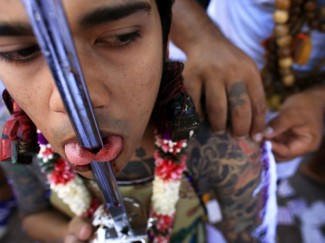 Milhares de pessoas participavam do festival vegetariano de Phuket, no sul da Tailândia, que começou nesta quinta-feira e que durante nove dias oferecerá espetaculares e sangrentos desfiles dos devotos taoístas, que exibem as torturas que se infligem para se purificar.Caminhar sobre brasas de carvão ardente ou perfurar as bochechas com sabres não fazem parte do dia a dia de um vegetariano clássico, mas para os participantes deste famoso festival tailandês trata-se de um clímax de devoção.